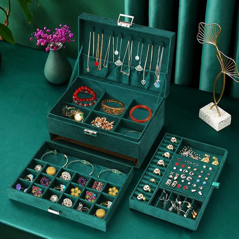 صندوق تنظيم مجوهرات محمول بتصميم مكون من 3 طبقات مزود بقفل ودرج واقسام قابلة للازالة، مناسب للنساء والبنات لحفظ الاقراط والخواتم والقلائد والاساور ونظارات الشمس، من نيوفانتي، ذهبي، سنط